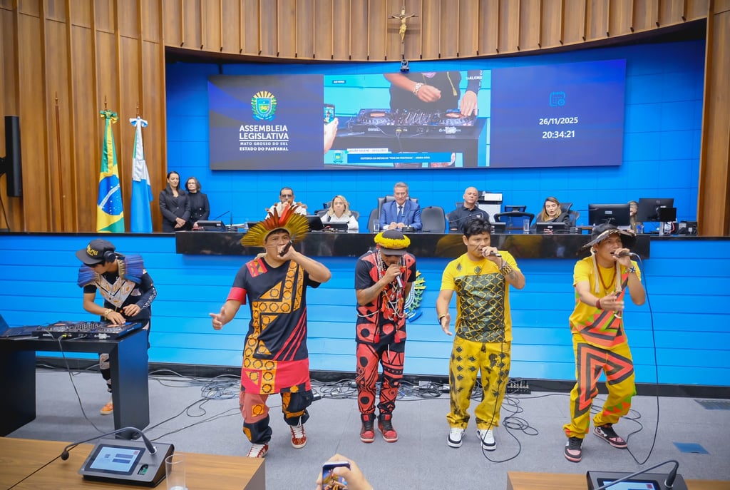 O grupo Brô MC’s, referência nacional e internacional no rap indígena, recebeu a Comenda Tom do Pantanal Arara Azul durante a Sessão Solene do Dia do Músico na Assembleia Legislativa. A homenagem, concedida por indicação da deputada estadual Lia Nogueira (PSDB), reconheceu a trajetória pioneira dos artistas que transformaram a música em instrumento de identidade, resistência e afirmação cultural.
